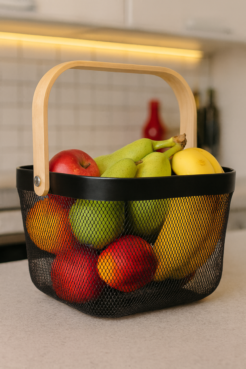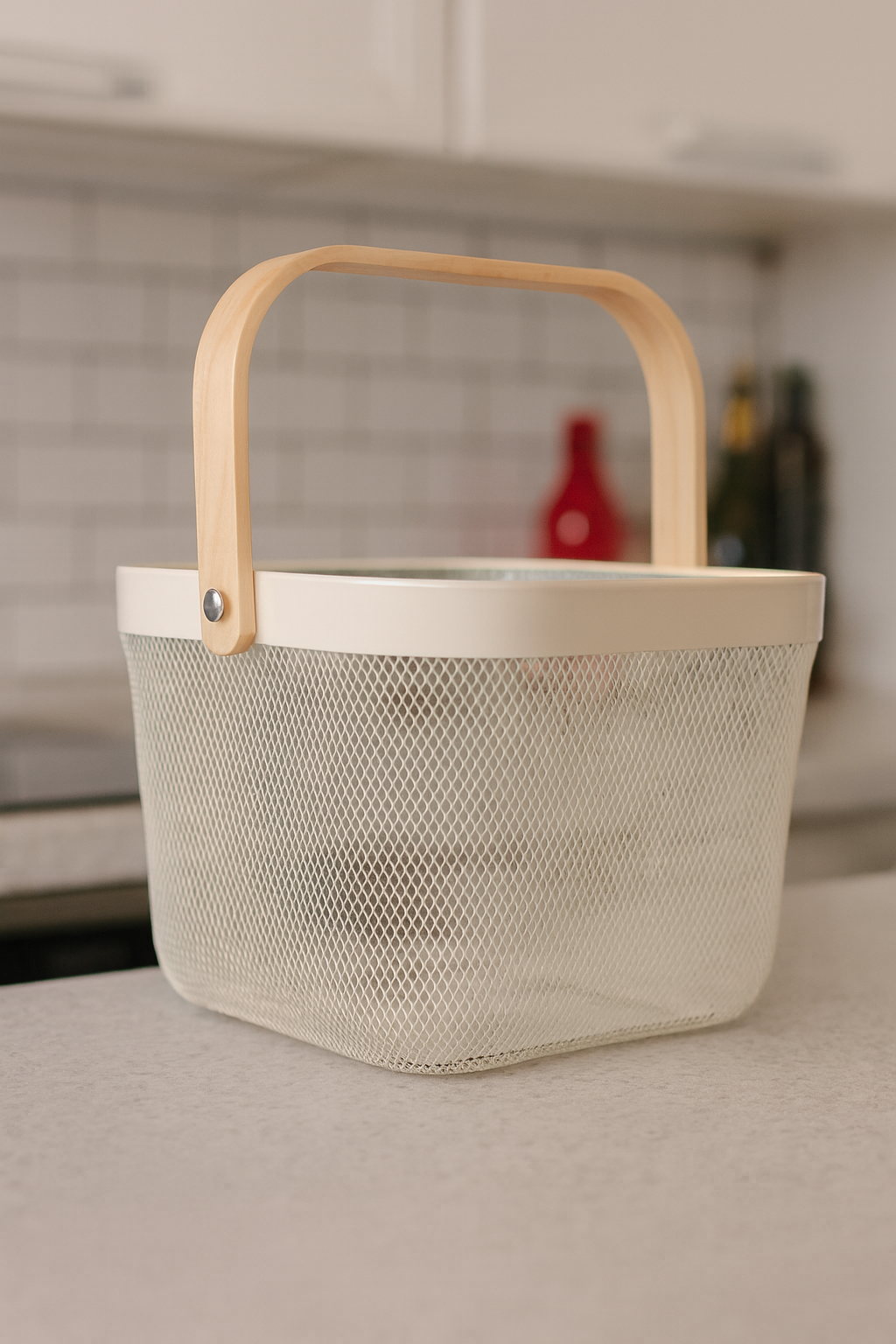 این سبد زیبا و کاربردی از فلز آبکاریشده مقاوم ساخته شده و دارای دسته چوبی طبیعی برای حمل آسان است. طراحی مربعی و توری شکل آن باعث میشود آب به راحتی خارج شده و گزینهای ایدهآل برای شستشو و آبکشی میوه و سبزیجات باشد.